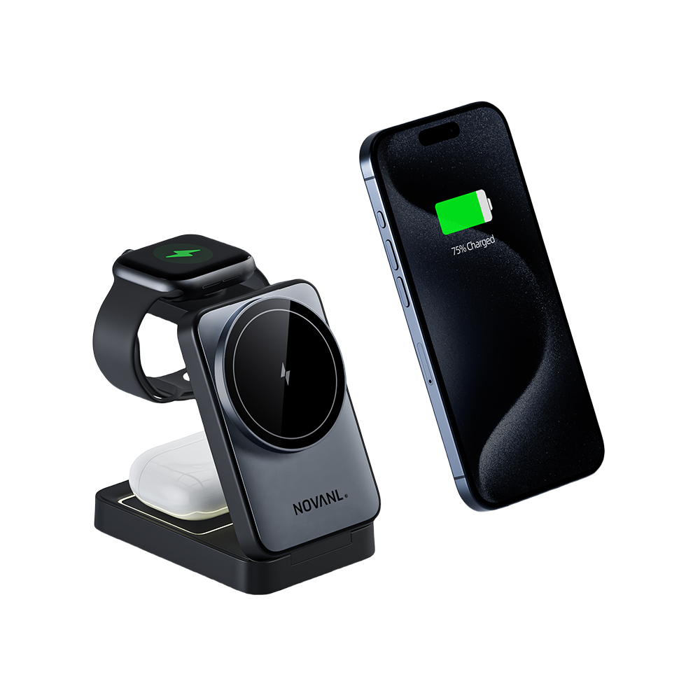 Kompaktes und platzsparendes Design: Wie der Name schon sagt, ist das NOVANL WireUp Compact Charging Dock so konzipiert, dass es Platz spart, ohne Kompromisse bei der Leistung einzugehen. Sein schlankes, leichtes Profil macht es perfekt für kleine Schreibtische, Nachttische oder Arbeitsplatten. Das minimalistische Design sorgt außerdem dafür, dass es sich in jede Umgebung einfügt, ohne Unordnung zu verursachen, was es sowohl funktional als auch stilvoll macht.