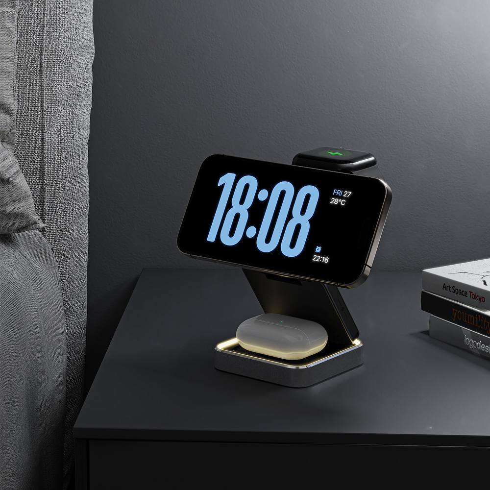 MagSafe- Kompatibilität : Das NOVANL WireUp Compact Pro ist vollständig MagSafe- kompatibel, d. h. es funktioniert nahtlos mit MagSafe -fähigen iPhones. Die integrierte magnetische Ausrichtung sorgt dafür, dass Ihr iPhone perfekt an Ort und Stelle sitzt und so effizient wie möglich geladen wird. Legen Sie Ihr Telefon einfach auf die Station und der magnetische Zug sorgt dafür, dass es für eine optimale Stromübertragung ausgerichtet ist . So können Sie ohne lästige Kabel oder Sorgen über eine Fehlausrichtung laden.